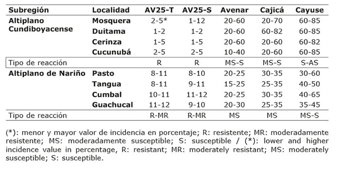 En relación con roya de la hoja (RH), los genotipos AV25-T y AV25-S presentaron valores de incidencia que no superaron el 12 % en las dos subregiones, con una reacción resistente para la subregión altiplano Cundiboyacense y de moderadamente resistente a resistente para la subregión altiplano de Nariño. Las variedades Avenar y Cajicá presentaron valores de incidencia de 10 % a 82 % con una reacción moderadamente susceptible a susceptible en el altiplano Cundiboyacense y de 15 % a 35 % en la subregión altiplano de Nariño con una reacción moderadamente susceptible. Cayuse presentó los mayores valores de incidencia en el altiplano Cundiboyacense (60 % a 85%) y en el altiplano de Nariño (35 % a 65 %), con una reacción susceptible a altamente susceptible en la primera subregión y de moderadamente susceptible a susceptible en la segunda subregión (Cuadro 7).