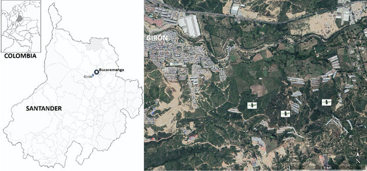 Figure 1. Location of the farms where the evaluation tests of the food attractants with McPhail traps, to capture M. viatrix were carried out, Llanadas, Giron, Santander, Colombia (Photo taken from GoogleEarth Pro, 2019).