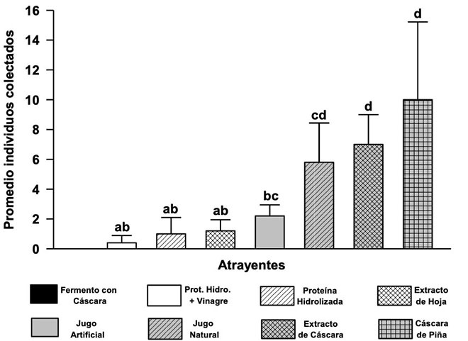Un total de 138 adultos de M. viatrix se capturaron con los diferentes atrayentes. Los resultados de las capturas de M. viatrix con cada uno de los atrayentes evaluados en trampas McPhail, se muestran en la Figura 2, observándose que los trozos de cáscara, el extracto de cáscara y el jugo natural de piña fueron los que presentaron mayores capturas (Figura 2).