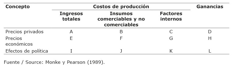 La metodología que se utilizó fue la matriz de análisis de política (MAP), con la que se pueden medir los efectos de fallas de mercado y de las distorsiones de política de precios que existen en un sistema productivo (Monke y Pearson, 1989). La MAP se integra de tres filas, la primera contiene los ingresos, los costos y las ganancias, medidas a precios privados; los precios privados son los que realmente reciben o pagan los productores en su actividad productiva (Salcedo, 2007). La segunda fila presenta los mismos rubros antes señalados, pero medidos a precios económicos, y la tercera fila mide las diferencias entre los datos de las dos primeras filas (SEPSA y FAO, 2006), con lo que se logran medir los efectos de políticas económicas o las transferencias dentro de un sistema de producción (Cuadro 1).