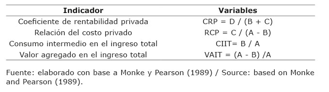 El valor agregado a precios privados (VAPP) es el monto que permanece en el ingreso recibido por el productor después de haber pagado el costo de los insumos comerciables y no comerciables, sin tener en cuenta el costo de los factores internos. El consumo intermedio en el ingreso total (CIIT) es todas aquellas erogaciones destinadas para la adquisición de insumos indispensables en otros sectores de la economía. El valor agregado en el ingreso total (VAIT) es la remuneración de los factores internos de la producción, así como la ganancia que obtiene el productor, su valor refleja el efecto del sistema de producción hacia el interior del propio sector productivo (Salcedo, 2007).