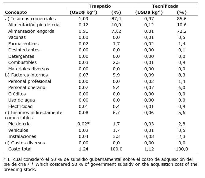 El costo promedio total de producción para el productor tecnificado fue 9,6 % menor que el promedio para los productores de traspatio, y básicamente se debió a costos más bajos en los insumos comerciables y no comerciables; no así en los factores internos, que fueron superiores al de la tecnificada. En los costos de los insumos comerciales de esta última, destacaron los menores costos en el alimento para la engorda y, en menor medida, el alimento para pie de cría. En los insumos no comerciales, sobresalieron los menores costos en los vehículos y en las instalaciones; en tanto que el costo del pie de cría fue mayor al de las granjas de traspatio. Finalmente, en los costos de los factores internos de la producción tecnificada, fue mayor a los de las producciones de traspatio, en este reglón destacaron el mayor costo en el personal profesional y la electricidad (Cuadro 3).