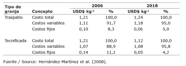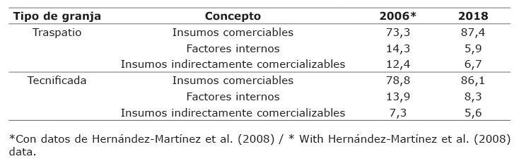 La estructura de los costos clasificados en costos fijos y costos variables, mostraron cambios en ambos tipos de granjas estudiadas en 2018, se observó un aumento de los costos variables y disminuciones en los factores internos y en los insumos no comerciales con respecto al 2006.
