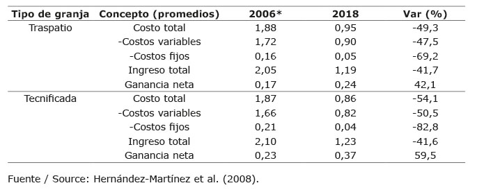 Los dos tipos de granjas en el 2018 presentaron ingresos positivos, en términos constantes y en dólares, y las ganancias representaron incrementos en relación a los obtenidos en 2006. Las ganancias netas en términos constantes, en ambos tipos de granja, tuvieron incrementos significativos, no obstante, la mayor ganancia se tuvo en la granja tecnificada (Cuadro 6), ello a pesar de que los ingresos totales también se redujeron, pero en menor medida que los costos fijos y variables (Cuadro 6).