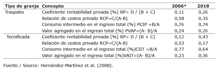 Los valores de la relación de costo privado (RCP) en 2018 variaron entre 0,1 y 0,2 en los dos tipos de granja, los cuales fueron menores a los estimados en 2006, los que se ubicaron entre 0,5 y 0,5 (Hernández-Martínez et al., 2008); en ambos periodos se observaron valores mayores a cero, pero menor que uno, lo que indicó que estos productores incrementaron su competitividad y recibieron ganancias extraordinarias con respecto a los estimados en 2006. Estos valores contrastan con los estimados por Magaña-Magaña et al. (2002), quienes estimaron para Yucatán (México) una RCP que fluctuó entre 0,2 y 0,9, siendo el valor más pequeño el de mayor competitividad. Para Michoacán, se obtuvo en 2010 una RCP de 0,3 (Martínez-Medina et al., 2015), lo que indicó una mayor competitividad con relación al estimado, por Barrón-Aguilar et al. (2000), para la misma entidad que lo ubicó entre 0,7 y 0,9; mientras que Hernández-Cruz et al. (2019) en Guanajuato, lo estimaron entre 0,3 y 0.7 para las granjas de ciclo completo.