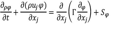 La simulación numérica de la dinámica de fluidos computacionales (CFD) resuelve, por medio de volúmenes finitos, la forma promediada de las ecuaciones de Navier-Stokes (Kim et al., 2017). En este estudio se usó el software comercial Ansys-Fluent (Ver. 18.1, ANSYS Inc., PA, USA). Para el cálculo del flujo de fluido, la ecuación de conservación, cantidad y energía con momento bidimensional escalar se representa en la ecuación 1.