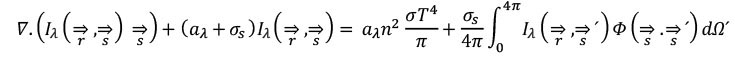 es el vector de la dispoersión; σs, aλ son los coeficientes de dispersión y absorción espectral; n es el índice de refracción; es el operador de divergencia; σ es la constante de Stefan-Boltzmann (5,669×10−8 Wm−2 °C−4); Φ, T y Ω son la función de fase, la temperatura local (°C) y el ángulo sólido, respectivamente.