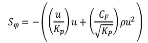 Donde, Sϕ es el término fuente incluido en la ecuación de movimiento que representa las fuerzas de arrastre inducidas por las mallas anti-insecto, y ρ y u son la densidad y la viscosidad dinámica del fluido, los valores de Kp y CF son coeficientes inerciales derivados de las propiedades aerodinámicas de cada pantalla y se establecen en función de su grado de porosidad (ε), con las ecuaciones 5 (permeabilidad del medio poroso) y 6 (factor de inercia del medio poroso) planteadas por Miguel (1998).