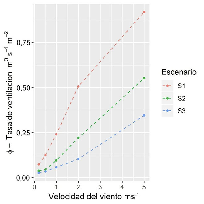 Las tasas de ventilación por unidad de superficie cubierta (Φ, m3m-2s-1) para cada configuración evaluada mostraron que los valores de Φ más elevados se obtuvieron en el escenario S1, donde el valor fluctuó paras las velocidades V1 y V5 entre 0,074 y 0,919 m3 m-2 s-1, mientras que para el escenario S2 los valores fluctuaron entre 0,038 y 0,552 m3m-2s-1 y para S3 variaron entre 0,027 y 0,346 m3 m-2 s-1 (Figura 7).