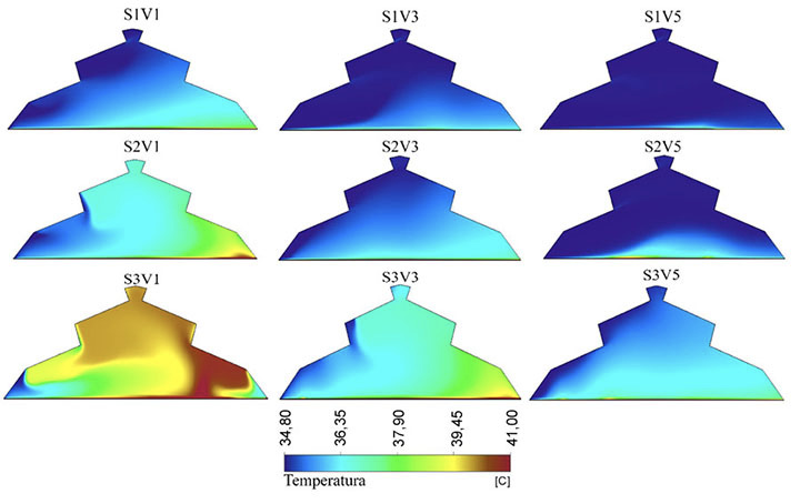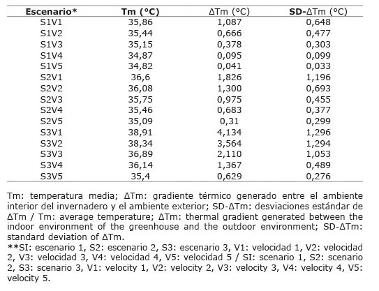 Los valores de temperatura media más bajos se obtuvieron para el escenario S1, donde este valor osciló entre 35,86 y 34,82 °C para V1 y V5, respectivamente, mientras que para estas mismas velocidades en S2 se obtuvieron valores más elevados, de 0,74 y 0,27 °C y para S3 3,05 y 0,58 °C, respectivamente (Cuadro 3). La homogeneidad del comportamiento térmico evaluada como la variación del valor de la temperatura entre puntos opuestos del invernadero exhibió valores inferiores a 0,5 °C para las velocidades de flujo de aire exterior superiores a 2 m s-1 V3 y V5 en cada uno de los tres escenarios simulados.