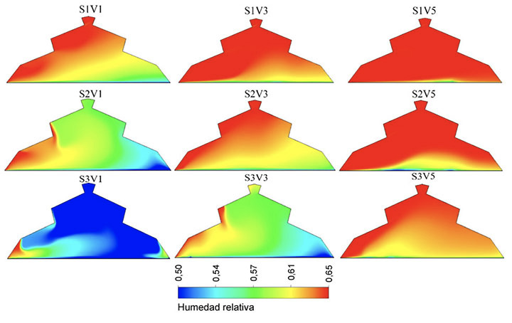 Los patrones de distribución de la humedad relativa encontrados para los escenarios simulados mostraron un ambiente con valores de humedad heterogéneos para los escenarios S1V1, S2V1, S3V1 y S3V3, a su vez estos escenarios fueron los de baja velocidad y alta heterogeneidad térmica (Figura 9).