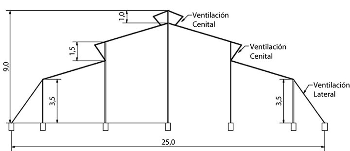 Figure 1. Cross-sectional profile of the flat roof greenhouse built and evaluated by the Caribia Research Center of the Corporacion Colombiana de Investigacion Agropecuaria (AGROSAVIA). Magdalena, Colombia, 2019.