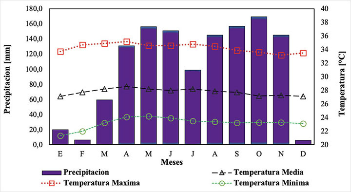 Figure 2. Climogram of the Caribia Research Center of the Corporacion Colombiana de Investigacion Agropecuaria (AGROSAVIA). Magdalena, Colombia, 2019.