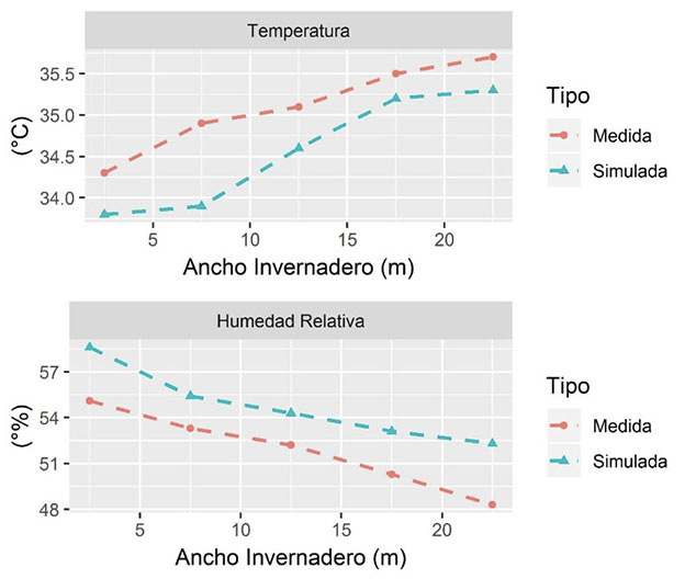 En general, se observó que el modelo subestimó los valores temperatura y sobreestimó los valores de humedad relativa, aunque se debe resaltar que el comportamiento espacial en el eje trasversal del invernadero exhibió una tendencia similar (Figura 4). Los valores de bondad de ajuste MAE y RMSE obtenidos para la temperatura fueron de 0,15 y 0,32 °C, mientras que para la humedad relativa se obtuvo valores 2,41 y 2,73 %, respectivamente.