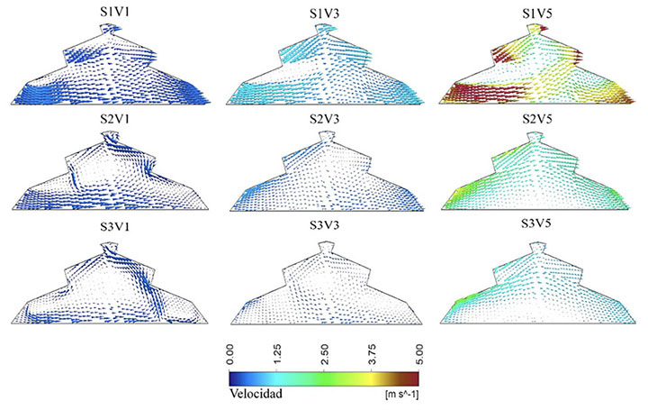 El comportamiento de los parámetros de flujo obtenidos en el escenario S1 para todas las velocidades analizadas, exhibió un comportamiento característico de un invernadero ventilado naturalmente y equipado con áreas de ventilación lateral y de techo.