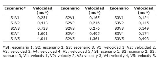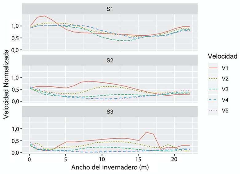 Los valores de velocidad media obtenidos en el interior del invernadero en un perfil transversal a una altura de 1,7 m para el escenario S1 variaron entre 0,251 y 4,011 ms-1, mientras que para el escenario S2 entre 0,165 y 1,361 ms-1 y para S3 entre 0,124 y 0,493 m s-1 (Cuadro 2). En términos generales, existió una reducción media de la velocidad de los flujos de aire con un valor de 55,8 y 74,3 % para S2 y S3, respectivamente, en comparación con los valores obtenidos en S1.