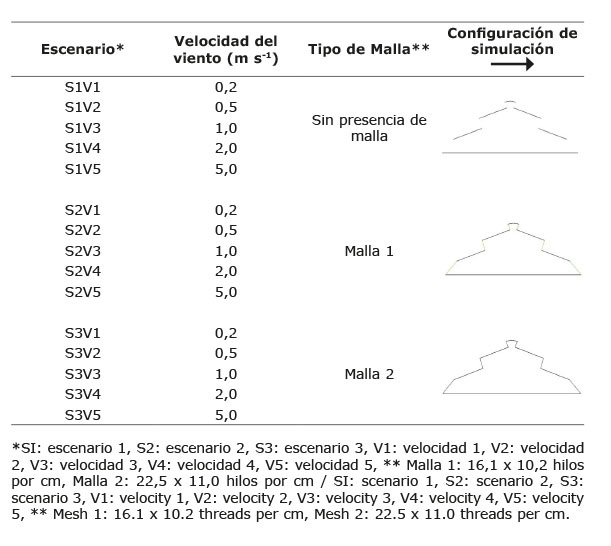 Las simulaciones numéricas de los flujos de aire se realizaron para tres escenarios específicos (S1, S2, S3), donde S1 es el escenario sin presencia de mallas anti-insecto en las áreas de ventilación, S2 y S3 corresponden a la presencia de las mallas anti-insecto M1 y M2, respectivamente (Cuadro 1). Adicionalmente se evaluaron cinco valores de velocidad de viento exterior V1 a V5 (0,2, 0,5, 1,0, 2,0 y 5,0 m s-1). La temperatura, la humedad relativa y la radiación, seleccionadas como condiciones iniciales correspondieron a los valores críticos diarios en la zona de estudio, sus valores fueron de 34,8 °C, 65 % y 850 W m-2, respectivamente y se mantuvieron constantes en cada caso simulado.