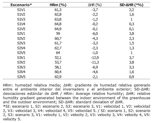 Table 4. Relative humidity parameters obtained from each simulated scenario in the flat roof greenhouse built at the Caribia Research Center of the Corporacion Colombiana de Investigacion Agropecuaria (AGROSAVIA). Magdalena, Colombia, 2019.