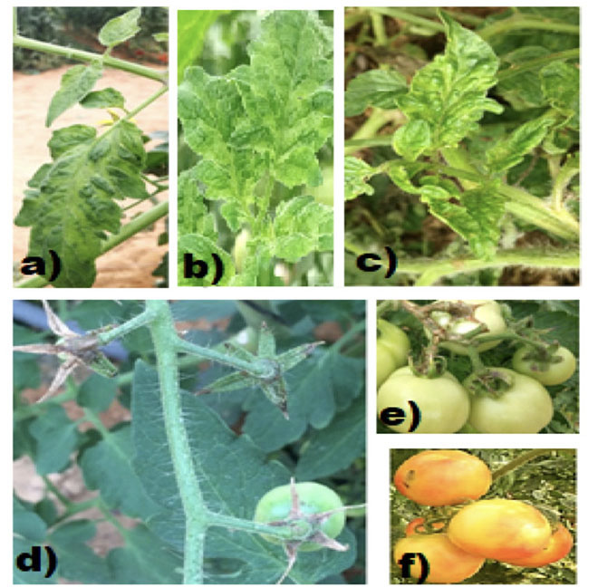 Figure 1. Tomato brown rugose fruit virus (ToBRFV): a, b, c) symptomatic mosaic pattern in tomato plant leaves; d) peduncles and dry chalices; e) necrotic symptoms in pedicles, calyces, and petioles; f) fruits with yellow spots (Adapted from Luria et al., 2017).