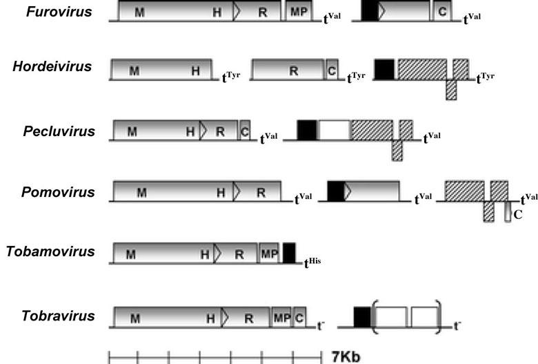 La familia taxonómica Virgaviridae fue recientemente descrita, y agrupa virus cuya partícula viral posee forma de bastón (Latín Virga). Incluye los géneros Furovirus (cinco especies), Hordeivirus (cuatro especies), Pecluvirus (dos especies), Pomovirus (cuatro especies), Tobamovirus (veinticinco especies) y Tobravirus (tres especies). Las características del grupo son, entre otras, proteínas de replicación de tipo alfa, genoma de ARN de sentido positivo con un motivo de ARN de transferencia asociado a su extremo 3’ terminal, forma de bastón de sus viriones y un canal central de 20 a 25 nm de diámetro. Además, las proteínas de cápside poseen tamaños que oscilan entre 19 a 24 kDa (Adams et al., 2009). En la Figura 2 se pueden visualizar las diferencias en los genomas de los virus pertenecientes a la familia Virgaviridae.