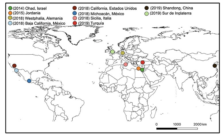 Luria et al. (2017), Salem et al. (2016), Menzel et al. (2019), Camacho-Beltrán et al. (2019), Chitambar (2018), Ling et al. (2019), Cambrón et al. (2018), Panno et al. (2019), Fidan et al. (2019), Yan et al. (2019), Skelton et al. (2019)De forma general, desde la aparición de ToBRFV en Israel y Jordania, se ha reportado y confirmado su presencia en ocho países (Figura 3), donde la fuente de transmisión es principalmente por inoculación mecánica, semilla contaminada y contacto entre plantas, y recientemente, se aborda el papel de los abejorros como portadores de inóculo primario de ToBRFV que contribuye a la propagación de la enfermedad en los tomates, ya que estos pueden haber transmitido el virus transfiriendo savia cruda usando sus mandíbulas, o mecánicamente a través de sus cuerpos vibrantes (Levitzky et al., 2019).