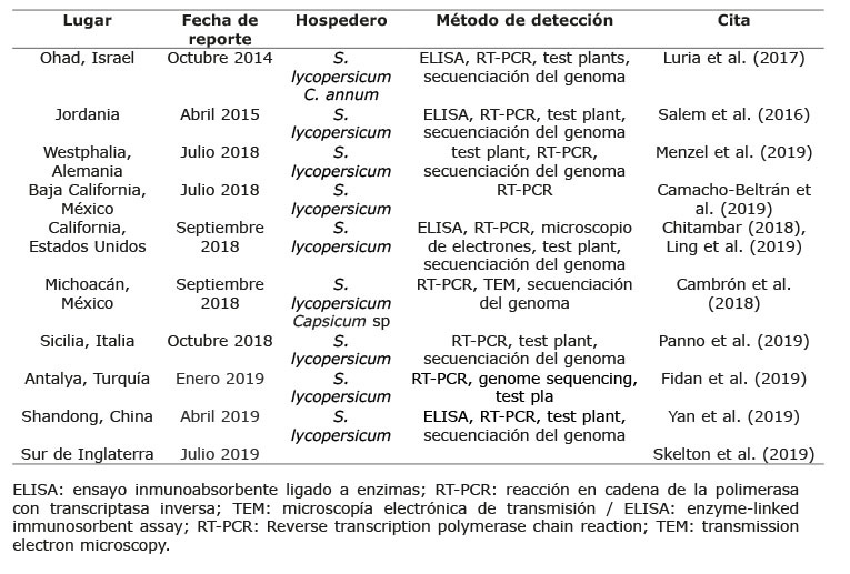 Posterior a la detección del virus de la fruta rugosa marrón del tomate (ToBRFV) en Israel y Jordania, la presencia de este virus se reportó en julio de 2018 en Westphalia, Alemania (Menzel et al., 2019), y Baja California, México (Camacho-Beltrán et al., 2019), en septiembre de 2018 en California, Estados Unidos (Ling et al., 2019) y en Michoacán, México (Cambrón et al., 2018); y en octubre de 2018 en Sicilia, Italia (Panno et al., 2019). Para el año de 2019 se reportó en Antalya, Turquía (Fidan et al., 2019); Shandong, China (Yan et al., 2019) y en sur de Inglaterra (Skelton et al., 2019).