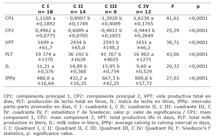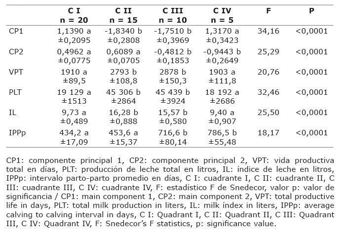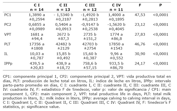 De la representación conjunta de los valores de CP1 (abscisa) y CP2 (ordenada): (a) las vacas del Cuadrante I, con valores positivos de ambos componentes, presentaron menor longitud de vida productiva, menor producción total de leche, menor índice de leche (CP1) y menor intervalo parto-parto promedio (CP2); (b) el Cuadrante II, con valores negativos de CP1 y positivos de CP2, fueron vacas con mayor longitud de vida productiva, mayor producción total de leche, mayor índice de leche (CP1) y menor intervalo parto-parto promedio (CP2). Las vacas del Cuadrante III, con valores negativos de ambos componentes, fueron vacas con mayor longitud de vida productiva, mayor producción total de leche, mayor índice de leche (CP1) y mayor intervalo parto-parto promedio (CP2). Las vacas del Cuadrante IV, con valores positivos de CP1 y negativos de CP2, fueron vacas con menor longitud de vida productiva, menor producción total de leche, menor índice de leche (CP1) y mayor intervalo parto-parto promedio (CP2).