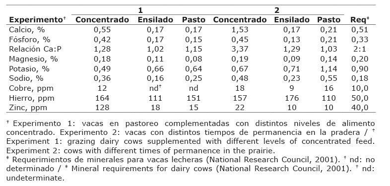 El contenido mineral de los alimentos consumidos por las vacas durante los dos experimentos se observa en el Cuadro 1.