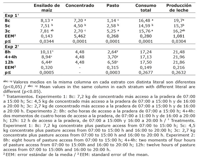 Table 2. Daily feed intake (kg MS) and milk production (kg día-1) of Holstein cows fed with different concentrate levels (Exp. one) and different grazing time in the meadow (Exp. two) in the Toluca Valley, Mexico. 2011-2012.