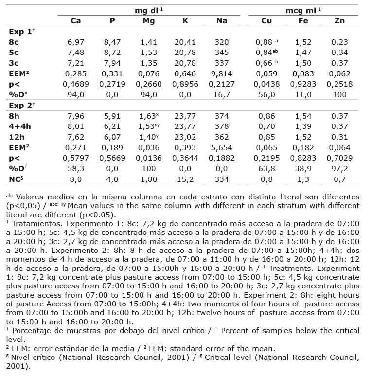 Independientemente del nivel de alimento concentrado o el tiempo de permanencia en la pradera, el contenido mineral en suero sanguíneo de los bovinos fue normal para P, Na, Cu y Fe, crítica para Ca; deficiente en Mg y Zn, y excesiva en K.