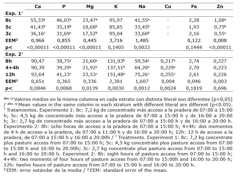 Diferencias entre tratamientos (p<0,05) por efecto del nivel de concentrado suministrado se observaron en el consumo de Zn, siendo mayor con el nivel de alimento concentrado más alto. En el experimento 2 no hubo diferencia (p>0,05) por efecto del tiempo de permanencia en la pradera; sin embargo, el consumo de Zn (13 ppm) fue menor al requerido (40 ppm) por vacas lecheras en lactación (National Research Council, 2001), indicando un aporte deficiente de Zn en la dieta.