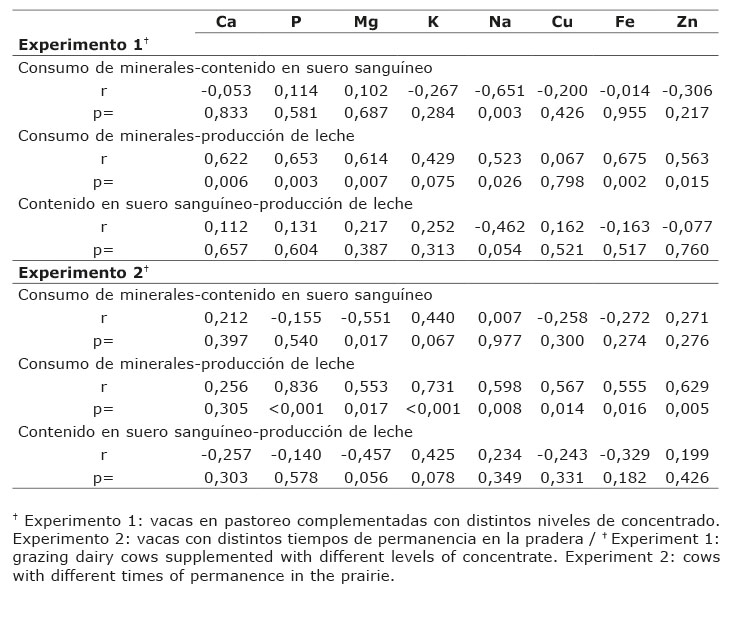 Los coeficientes de correlación entre las variables de consumo de minerales, producción de leche y contenido mineral en suero sanguíneo de bovinos complementados con distinto nivel de alimento concentrado (experimento uno) y con diferente tiempo de permanencia en la pradera (experimento dos) se indican en el Cuadro 5.