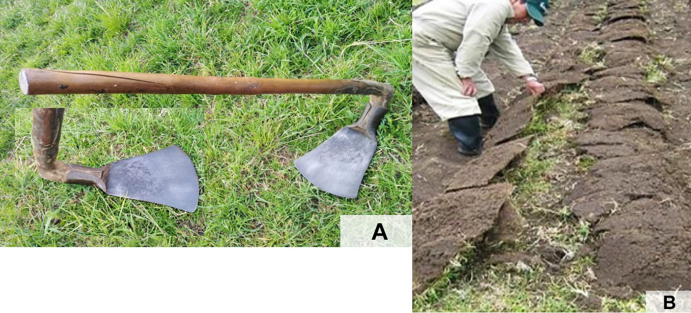 El cultivo de papa (Solanum tuberosum) en wachado consiste en el mínimo laboreo del suelo en la siembra y en la utilización del cespedón (porción superficial de césped y suelo, Figura 1b) de la pastura, para lo cual se cortan con una herramienta manual denominada pala de cute (la pala de cute es una pala a la cual se adiciona con soldadura una extensión de hierro y un mango de madera curvo, Figura 1a) que corta y voltea cespedones hacia adentro para formar el surco denominado wachu.