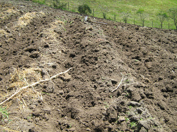 Figure 2. Disturbed soil for the work of covering the seed in the system of potato (Solanum tuberosum) sowing in wachado (furrow or ridge) in Andean slopes of the department of Nariño, Colombia. 2014.
