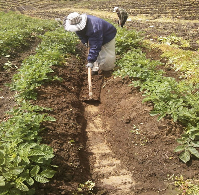 Figure 3. Removal of the soil in the interfurrow to make the first hilling that favors soil losses due to runoff on the Andean slopes of the Nariño department, Colombia. 2014.