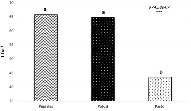 Las localidades de Pupiales y Potosí presentaron la mayor pérdida de suelo con 65,84 y 64,98 t ha-1, respectivamente. La pérdida en Pasto fue 34 % menor con 43,49 t ha-1 (Figura 4).