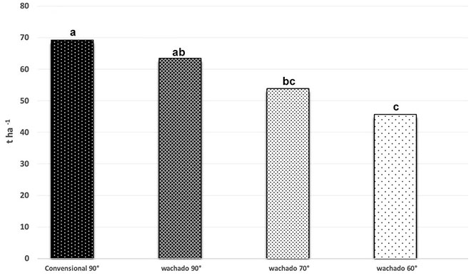 La labranza comercial y el wachado a 90°, presentaron mayor pérdida de suelo con 69,28 y 63,5 t ha-1 respectivamente; al pasar a wachado a 60 y 70°, la pérdida de suelo disminuyó 35 % y 23 %, respectivamente, frente a labranza comercial. La pérdida de suelo en wachado a 70° fue de 53,5 t ha-1, un 23 % y 16 % menor frente a labranza comercial y wachado a 90°, respectivamente (Figura 5).