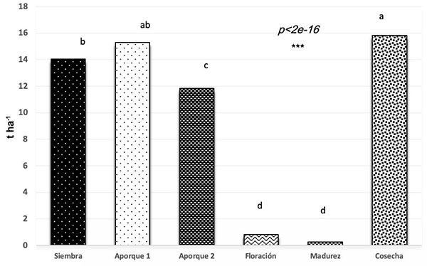 Las menores pérdidas de suelo en floración en agosto y en madurez en septiembre (0,83 y 0,26 t ha-1) se explican en gran parte en el hecho que, durante esos periodos de cultivo, no se realizaron labores drásticas de remoción de suelo. En efecto, si hubo que controlar malezas que aparecieron principalmente en los bordes del entresurco, se realizó con herbicida o con machete, labores que igual generaron desprendimiento de suelo hacia el canal del entresurco pero que fue menor; en cosecha la pérdida de suelo volvió a aumentar (15,82 t ha-1), debido a que se utilizó de nuevo la herramienta manual con remoción total del surco y a que la precipitación también aumentó (Figura 6).