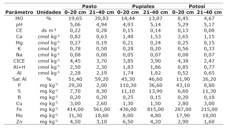 Table 1. Soil chemical analysis results at two depths for the study locations, Nariño, Colombia. 2014.