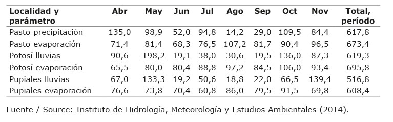 Table 2. Average monthly precipitation and evaporation (mm) of the subregion Nudo de los Pastos, Nariño, Colombia. 2014.