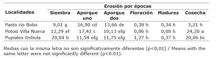 Las menores pérdidas de suelo fueron entre 0,38 y 1,27 (t ha-1) y se presentaron en las épocas de floración y madurez en las tres localidades, sin diferencias estadísticas entre estas; asimismo, las mayores pérdidas se presentaron en cosecha, aporque uno, siembra y aporque dos en las tres localidades (Cuadro 3). La pérdida de suelo de las épocas varió con la localidad; en siembra y cosecha, la pérdida de suelo en Pasto fue en promedio, 46 % y 73 % menor en comparación con las otras dos localidades, pero en aporque dos fue 18 % mayor. En general, en las tres localidades las menores pérdidas coincidieron cuando no se usó la pala de cute y solo se hicieron controles sanitarios con bomba de espalda y machete para cortar malezas en el borde del surco (Cuadro 3).