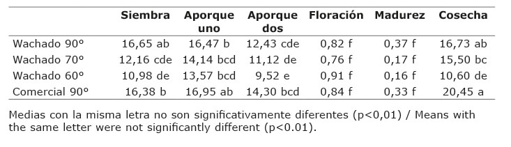 Con excepción de la pérdida de suelo en floración, en todas las épocas, la pérdida de suelo disminuyó al reducir la inclinación del surco; en cosecha, la pérdida de suelo del wachado a 60° se redujo 48 % y 37 % frente a labranza comercial y wachado a 90°. En siembra, la reducción fue del 33 % y 35 % (Cuadro 4).
