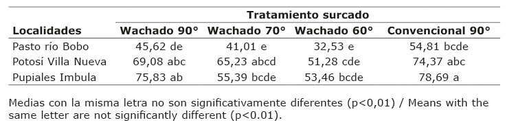 La pérdida de suelo durante los cinco meses de cultivo fue afectada en forma significativa (p<0,001) por los factores nivel de inclinación de surcado y localidad. Las mayores pérdidas totales de suelo se alcanzaron en surcos en el sentido de la pendiente (90°) y en las localidades de Potosí y Pupiales. En labranza comercial la pérdida fue 74,37 y 78,69 t ha-1 y para wachado a 90° 69,08 y 75,83 t ha-1 para Potosí y Pupiales, respectivamente; en este nivel de inclinación, la pérdida de suelo se redujo a 54,81 t ha-1en labranza comercial y 45,62 t ha-1 en wachado a 90° en Pasto (Cuadro 5).