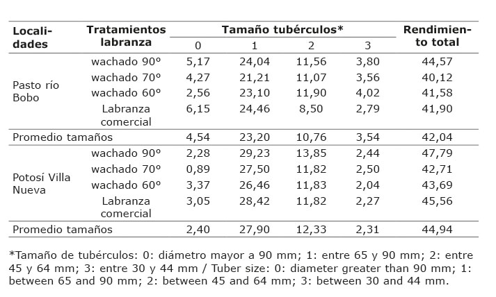 Table 6. Yield of potato (Solanum tuberosum) tubers (t ha-1) by size and total in wachado (furrow or ridge) in two localities of Nariño, Colombia. 2014.