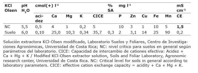 La investigación se realizó en la Finca Experimental de la Universidad de Costa Rica en el cantón de Santa Cruz, Guanacaste, durante el periodo marzo – julio del 2018. La finca se encuentra localizada a 10°17’6,24” latitud N y 85°35’42,95” longitud O, a una altitud aproximada de 54 msnm. El sitio presenta un clima estacionalmente seco, con precipitaciones promedio de 1 834 mm año-1 entre los meses de abril – noviembre y seco entre diciembre – marzo y una temperatura promedio de 27,9 °C. Por sus condiciones climáticas y de relieve, los principales suelos de la finca son de textura arcillosa con características vérticas y se reconocen como Vertic Haplustalfs asociados a Typic Haplusterts y Typic Ustorthents (Guzmán, 1987; Salazar, 1991; Vega & Salas, 2012). Los suelos presentan concentraciones disponibles de Ca, Mg, K, Cu Fe y Mn, según los niveles críticos no tienen problemas de acidez intercambiable ni de salinidad (CE), su pH es óptimo para la absorción de nutrimentos por las plantas, el P presentó concentraciones muy bajas (2 mg l-1) y el Zn mostró valores cercanos al nivel crítico (Cuadro 1).