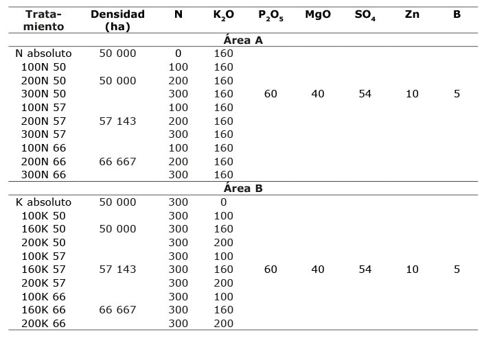 Para establecer los ensayos de fertilización con N y K, el terreno preparado recibió una base de 60, 40, 54, 10 y 5 kg ha-1 de P2O5, MgO, SO4, Zn y B, con un fraccionamiento de 20 % a los 10 días después de siembra (dds), 40 % a los 30 dds y el restante 40 % a los 45 dds. Se evaluaron los factores de densidad bajo el efecto de un nutrimento, para esto se establecieron dos experimentos simultáneos en forma separada con el fin de evaluar los factores N y K por separados en función de la densidad de siembra. Posteriormente, el área se dividió en dos partes de manera que a la primera área (A) se le adicionó dosis de N a razón de: 100, 200, 300 kg ha-1 con una base de 160 kg ha-1 de K2O y a la segunda área (B) dosis de K2O de 100, 160 y 200 kg ha-1 con una base de 300 kg ha-1 de N (Cuadro 2). Estos rangos fueron seleccionados según los rangos encontrados en la literatura, se seleccionaron dosis intermedias de los nutrimentos y con base en la concentración química de nutrimentos del suelo. Las aplicaciones de fertilizantes se realizaron de forma manual con medidas específicas de las distintas fórmulas para cada tratamiento. Las dosis físicas de N y K se prepararon con las fuentes: nitrato de amonio (33,5 – 0 – 0), Kmag (0 – 0 –22 – 18 – 22), fosfato diamónico (18 – 46 – 0), cloruro de potasio (0 – 0 – 60), sulfato de zinc (17 % SO4 y 31 % Zn) y ácido bórico (17,5 %). Para el cálculo del uso eficiente de nutrimentos se establecieron unidades experimentales sin fertilización de N y K.
