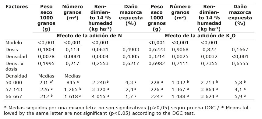 En el experimento con dosis crecientes de K hubo un efecto significativo para el factor densidad de siembra. Esta se encontró sobre las variables de rendimiento, a excepción de la variable peso seco de 1000 granos. El mayor número de granos por m2 y del rendimiento total se obtuvo con las densidades de 57 143 y 66 667 plantas ha-1. La interacción densidad de siembra y dosis de N no afectaron la variable mazorca expuesta, aunque con el incremento en la dosis de K los mayores porcentajes de esta variable se dieron con las densidades de siembra de 50 000 y 66 667 plantas ha-1.