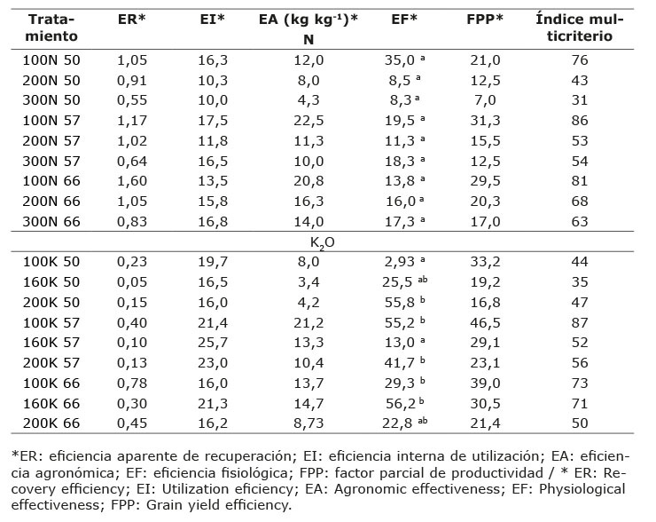 La mayor eficiencia en el uso de N y K se encontró con la aplicación de 100 kg de cada elemento a la densidad de 57 000 plantas ha-1. El mayor índice multicriterio se logró con la adición de dosis bajas de N y la densidad de 57 143 plantas ha-1 (Cuadro 4). La aplicación de K causó un efecto similar al de la adición de N; así para las variables eficiencia agronómica (EA) y factor parcial de productividad (FPP), los mayores índices de rendimiento se obtuvieron con dosis bajas de N y una densidad de 57 143 plantas ha-1, efecto similar al encontrado para FPP con dosis bajas de K a las mismas densidades.