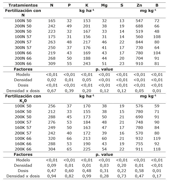Las densidades de siembra y las dosis de N afectaron la absorción de N, P, K, Mg, S, Zn y B. La dosis de 200 kg de N ha-1 en densidades de 50 000 y 57 143 planta ha-1, mostró la mayor absorción, es posible que estas acumulaciones se presentaron en función de la biomasa que alcanzaron las plantas de maíz, debido a que este incremento es correlativo con P, K, Mg, S y Zn. Este mismo efecto se encontró en la dosis de 300 kg de N ha-1 en la densidad de 66 667 plantas ha-1; no obstante, al analizar las acumulaciones de B en la planta, se presentó una mayor acumulación con las dosis más bajas de N. La mayor acumulación de N en el sistema (309 kg ha-1) se presentó en plantas sembradas a las densidades más elevadas con una dosis de 300 kg N ha-1.