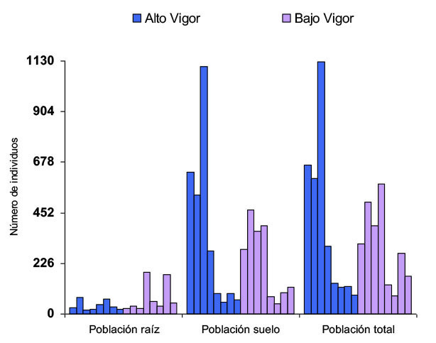 La población cuantificada por lotes de plantas de plátano estudiados (AV y BV) presentó una respuesta divergente entre la cantidad de individuos contados y el tipo de muestra estudiada (Figura 2). No existió diferencia estadística entre los lotes de plantas de plátano en la cantidad de nematodos presente en muestras de suelo y en las poblaciones totales. Sin embargo, se observó una tendencia de mayor población de nematodos fitopatógenos en el suelo de lotes de plantas de plátano con alto vigor con respecto a los de bajo vigor. Mientras que, en las muestras de raíz, a pesar de que la población acumulada fue la más baja, los resultados indicaron diferencias estadísticamente significativas entre lotes de plantas de diferente vigor, en el caso de bajo vigor presentó el 65,60 % de la población total, mientras que los de alto solo el 34,39 %.